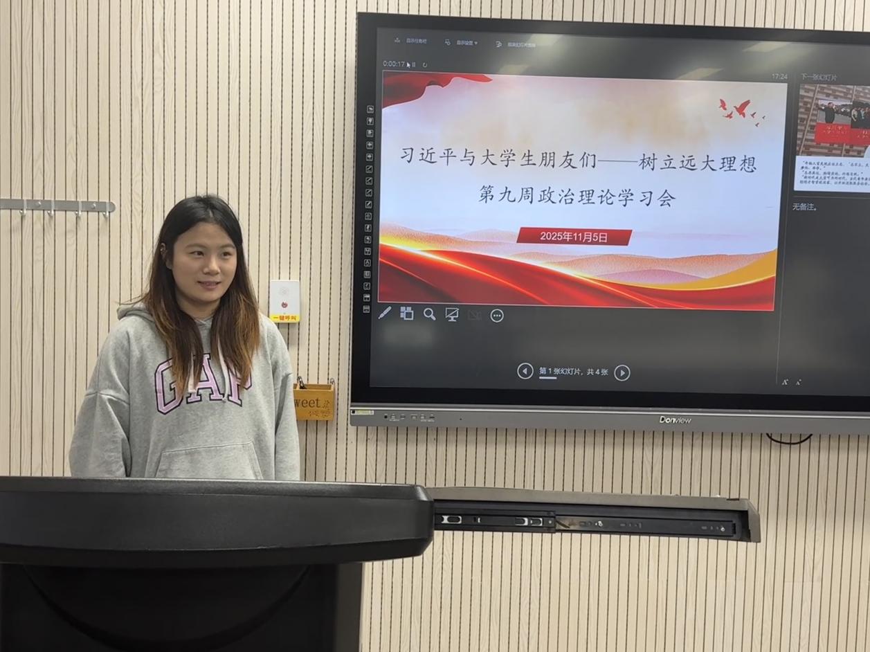 会上,大家认真观看了《习近平与大学生朋友们》系列之“树立远大理想”,生动再现了习近平同志在地方和中央工作期间关心指导大学生成长成才的鲜活故事,充分展现了习近平总书记 “做青年朋友的知心人、青年工作的热心人、青年群众的引路人”的光辉典范。在交流环节,冯方卓同学表示,作为新时代青年,我不能只做“旁观者”,更要争当“参与者”。陈佳奇同学表示,我们不仅需要掌握专业知识,更要关注社会发展、培养社会责任感。未来将继续以习近平总书记重要讲话精神为指引,勇担使命,在实践中砥砺品格、增长才干。