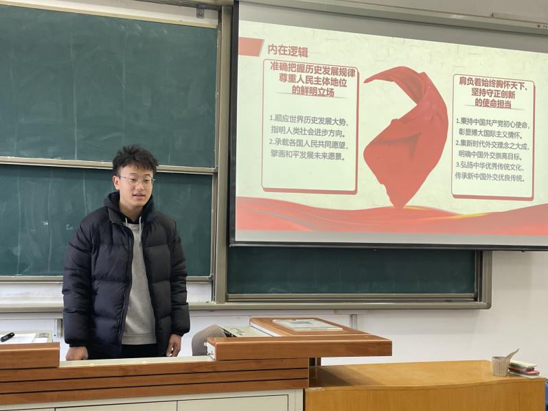 刘一萱谈到:“我深刻体会到,在各国命运紧密相连的今天,独善其身既不可能也不可取。构建人类命运共同体,倡导合作共赢、同球共济,才是应对全球挑战、开创美好未来的正道。这一理念必将凝聚起更强大的国际合力,推动人类社会走向更加光明、公正的未来。”宋金林补充道:“构建人类命运共同体理念体现了中国共产党超越狭隘国家利益、立足人类整体命运的全球视野,是马克思主义国际主义在新时代背景下的升华。学习习近平外交思想,不仅是对我国外交实践的深刻认识,更是对‘现代化中国为世界贡献中国方案’的理解升华。”
