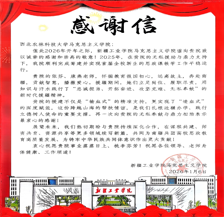 近日,学院收到了来自新疆工业学院百富策略白菜网站大全的感谢信。信中对学院的无私援建以及张芬、康燕两位老师的辛勤付出致以诚挚谢意与崇高敬意。